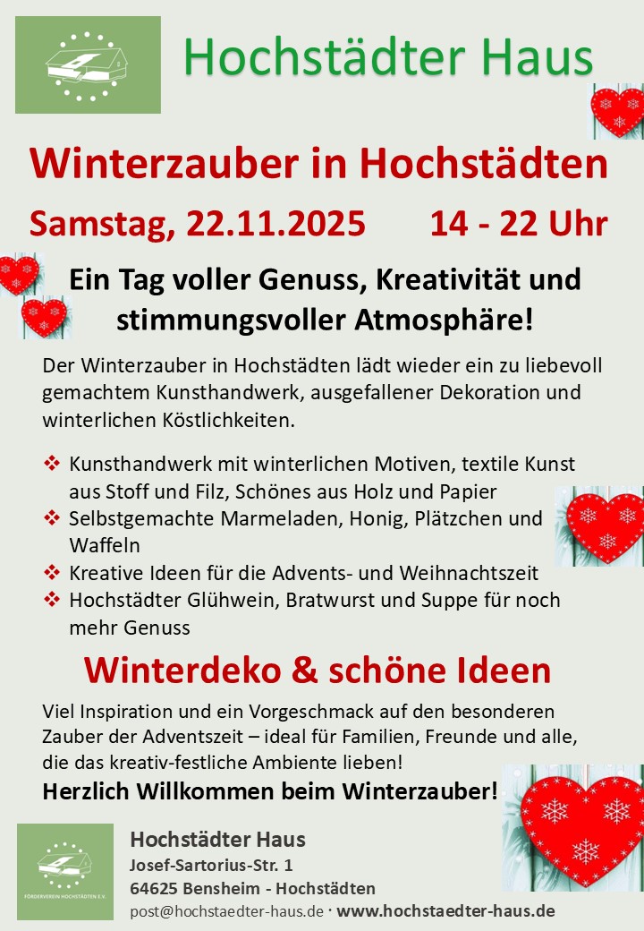 Der Winterzauber ist zurück und bringt festliche Stimmung nach Hochstädten! In liebevoll geschmückter Atmosphäre erwarten euch handgemachtes Kunsthandwerk, zauberhafte Dekoideen und winterliche Leckereien, die Lust auf die Adventszeit machen.