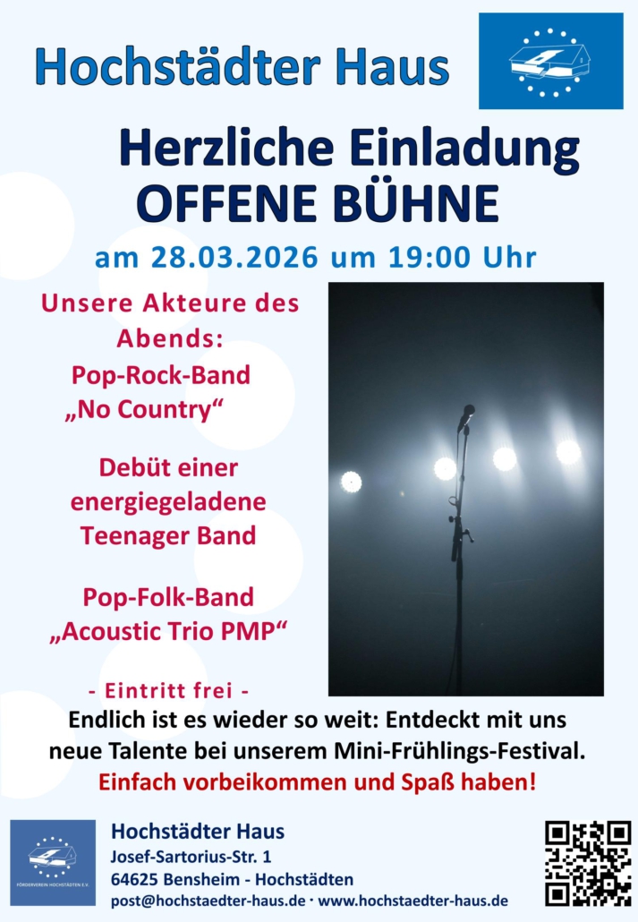 Erleben Sie den Frühling von seiner musikalischsten Seite und feiern Sie mit uns ein besonderes Mini-Festival der Offenen Bühne. Freuen Sie sich auf einen inspirierenden Abend voller Live-Musik, junger Talente und mitreißender Klänge – eingebettet in die warme und einladende Atmosphäre des Hochstädter Hauses.